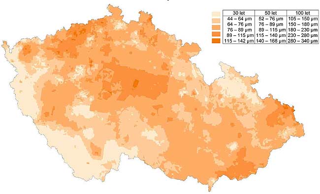 Pro patinující ocel byly vypočteny korozní rychlosti roční expozice (prvého roku expozice), tedy s dosazením t = 1 do rovnice znehodnocení. Mapa 1 a Mapa 3 uvádějí rozložení průměrných korozních úbytků při různých úrovní koncentrace oxidu siřičitého jako dominantní složky znečištění ovzduší v r. 2010 a 2001. Plošná distribuce korozního úbytku patinující oceli vypočtená pro dlouhodobé expozice 30, 50 a 100 let (s dosazením t = 30, 50 a 100) je uvedena jako Mapa 2.